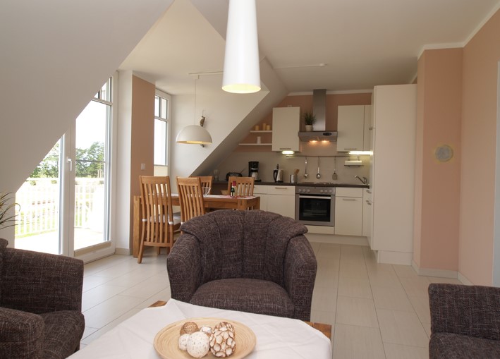 Mit Blick auf die Ostsee ist die Wohnung mit einer kompletten Küche und einem Bad inkl. Badewanne ausgestattet.